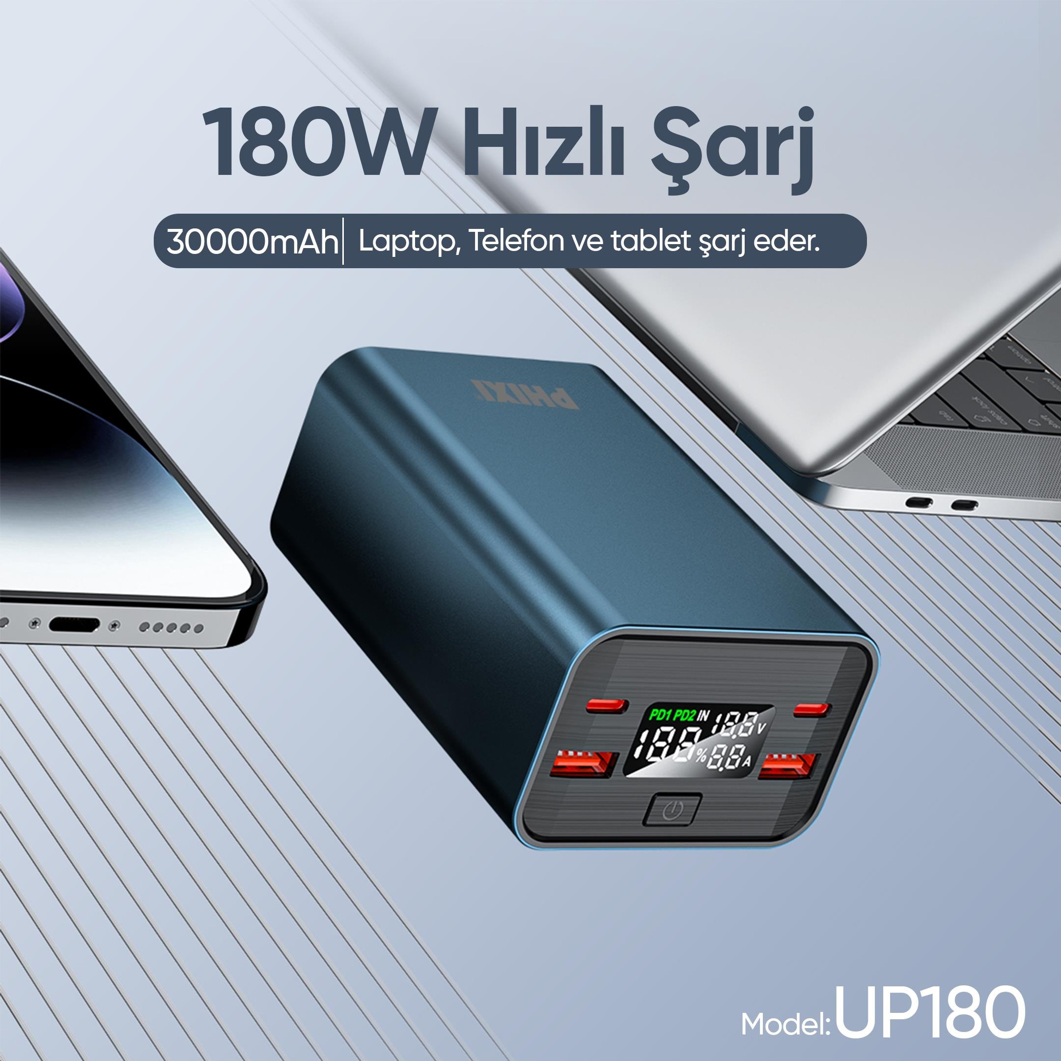 Phixi Ultimate UP180 30.000mAh 4 Çıkışlı LCD Göstergeli Powerbank